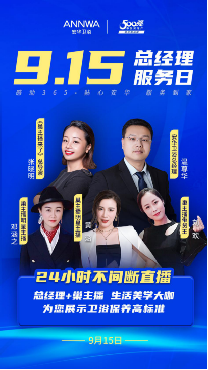 为了回馈广大消费者,值9·15总经理服务日之际,安华卫浴还精心推出爆款产品,精品特供,惊喜不断,趁此机会,赶紧来拔草,加入安华卫浴消费者队伍,享受优质产品带来的品质生活,还有贴心服务带来的舒心生活吧!近二十年的温暖行动,让安华卫浴在广大消费者心中生根发芽,相信本次全国联动“9.15总经理服务日”的线上直播开展,将再次扩大品牌的影响力,与消费者走得更贴近、更贴心,安华卫浴细致入微的服务体系将为品牌带来服务的全新变革。